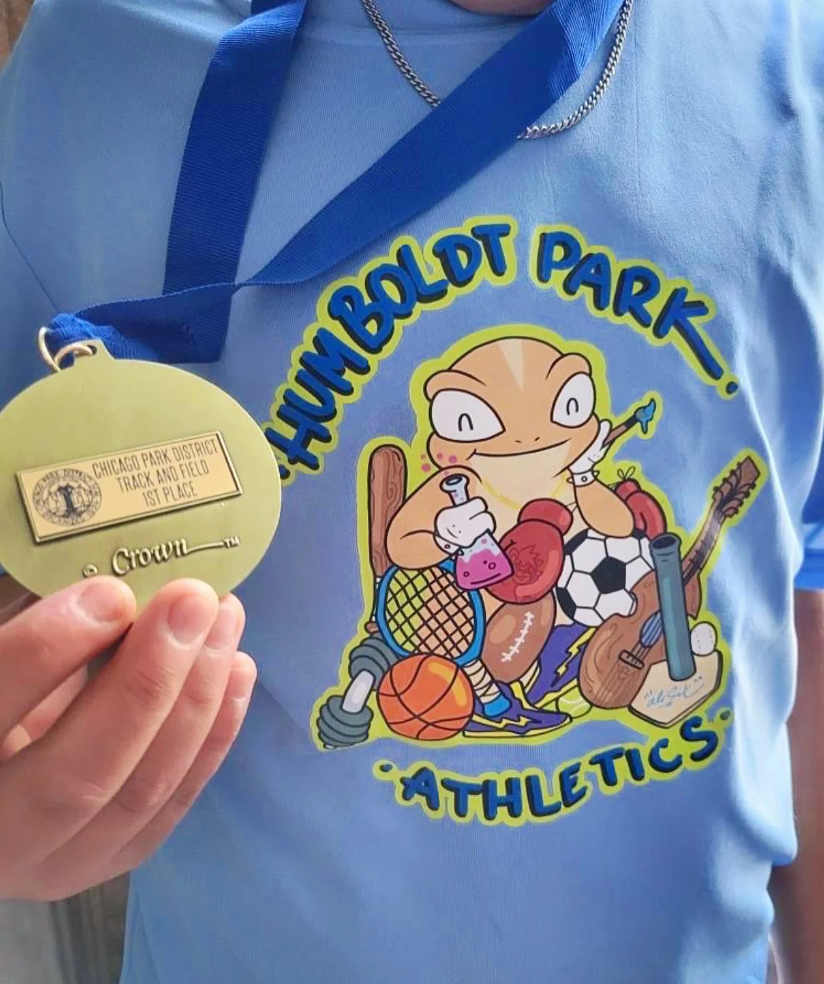 Ali Six designed the team jerseys for the Humboldt Park track and field team and made an alternate shirt for adults as a fund raiser for new gym equipment.